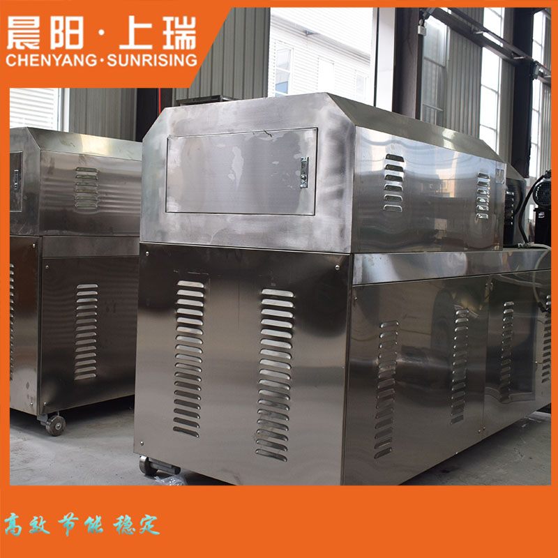 反向旋轉雙螺桿擠壓膨化機一般采用兩根尺寸完全相同,但螺紋方向相反的螺桿。向內旋轉和向外旋轉的區別在于壓力區的位置不同,雙螺桿向內旋轉產(chǎn)生的壓力為上高下低,物料通過(guò)雙螺桿時(shí),在入口會(huì )產(chǎn)生極高的壓力,造成進(jìn)料困難,這種向內反向旋轉式很少采用;雙螺桿向外旋轉產(chǎn)生的壓力為上低下高,有利于進(jìn)料。但反向旋轉與同向旋轉相比,物料在螺桿內形成的C形物料流不能從一根螺桿移向另一根螺桿,物料產(chǎn)生的混合程度顯著(zhù)降低,其自潔能力也沒(méi)有同向旋轉雙螺桿有效和穩定。