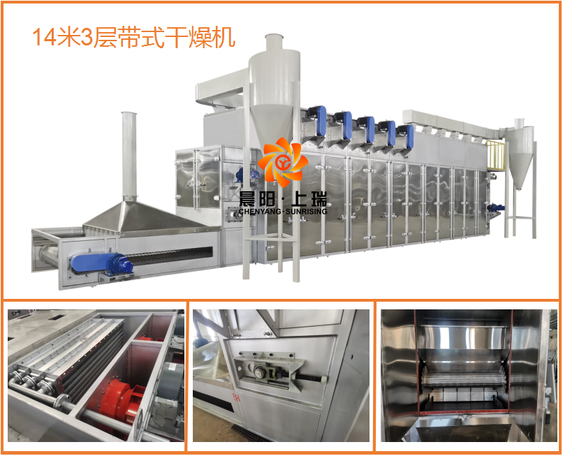 干燥方面,客戶(hù)技術(shù)指標,成品大于2H/h,脫水率:32%降至5%以?xún)?,對脫水干燥能力具有較高的要求, 晨陽(yáng)干燥機本次配置14米3層干燥機,帶寬2米,箱室高度達2.4米,通風(fēng)對流效果好,中間段12米,2米一節。使用不銹鋼鏈板網(wǎng)帶,使用壽命長(cháng),鏈板基本上沒(méi)有維修率,鏈板沖孔方式使用晨陽(yáng)設計的新技術(shù),透風(fēng)性好,支撐能力強,托料能力強。一平方承載22.5-35公斤物料。3層鏈板獨立變頻調速,烘干停留時(shí)間30-90分鐘。2段控溫,自動(dòng)比例調節閥。蒸汽加熱,使用碳鋼無(wú)縫管鋁翅片,散熱好,能源利用高,獨立變頻的排濕系統,濕度數顯,數據化操作。出料端設計3米強制冷卻段,迅速降低顆粒表面溫度。確保在后端噴涂前工藝緩沖倉不會(huì )因溫度過(guò)高產(chǎn)生熱汽結團