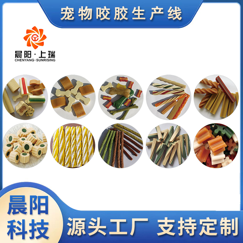 寵物咬膠生產(chǎn)線(xiàn)的核心生產(chǎn)工藝流程包括以下幾個(gè)步驟:原料攪拌、原料輸送、擠出成型熟化、冷卻降溫、切斷成型、多層烤箱熟化、冷卻輸送和包裝。
