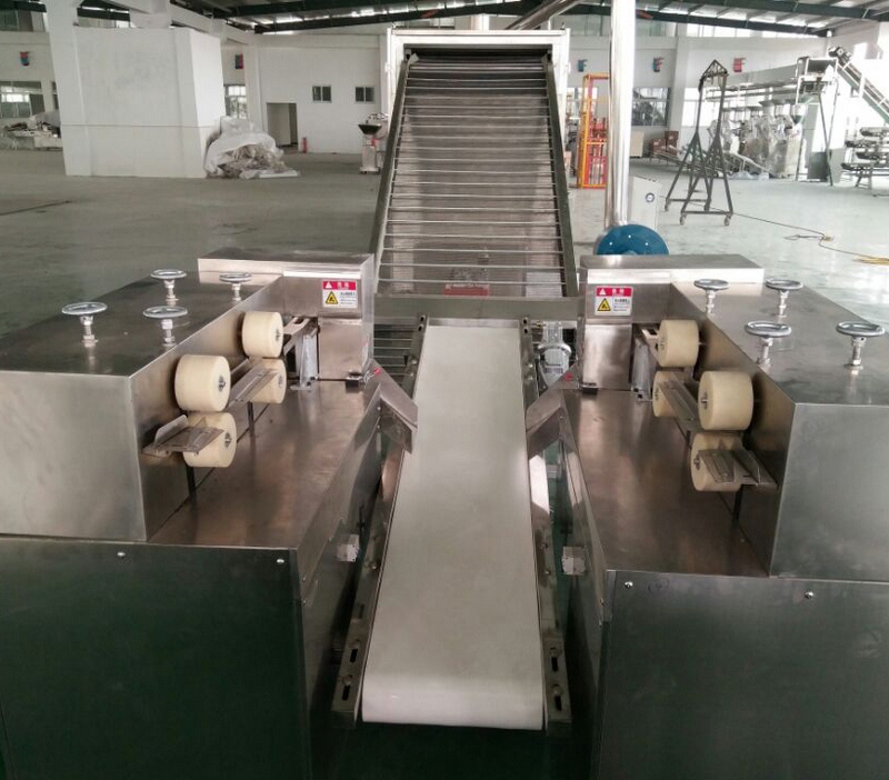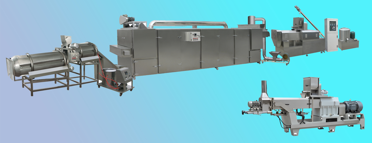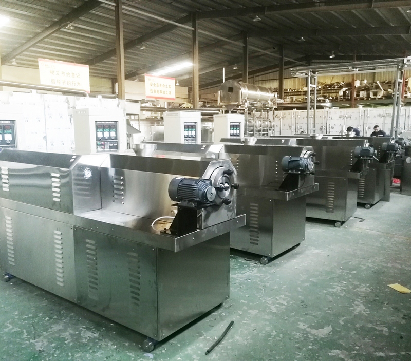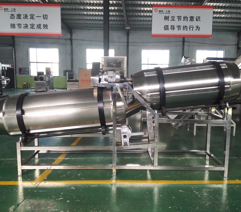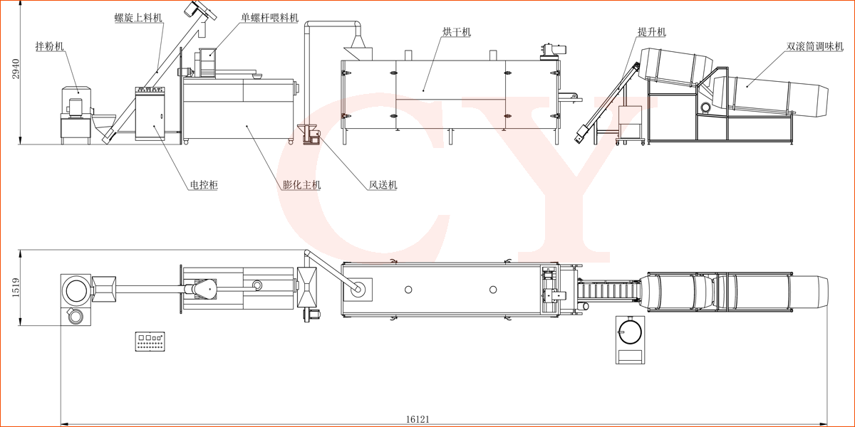 拌粉機→螺旋上料機→雙螺桿膨化機→風(fēng)送機→三層烤箱→中提升機→-雙滾筒調味機→電子包裝機