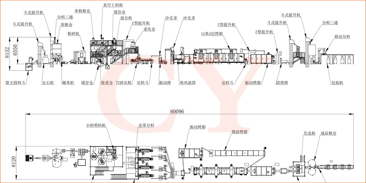 自動(dòng)配料預處理-粉碎-混合-擠壓熟化-均質(zhì)-震動(dòng)烘干-二次烘干-冷卻