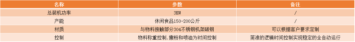 設備組成:400皮帶上料機、50kg稱(chēng)重斗、25KG調味粉添加機、50L噴油機、50KG正反轉調味滾筒。